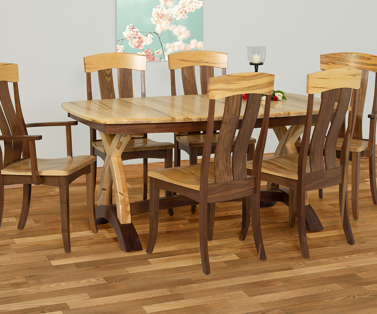 Table shown 42×66″ in wormy maple and walnut combo with clear finish. Bowed side and ends top with sydney harbor edge. Portland chairs.