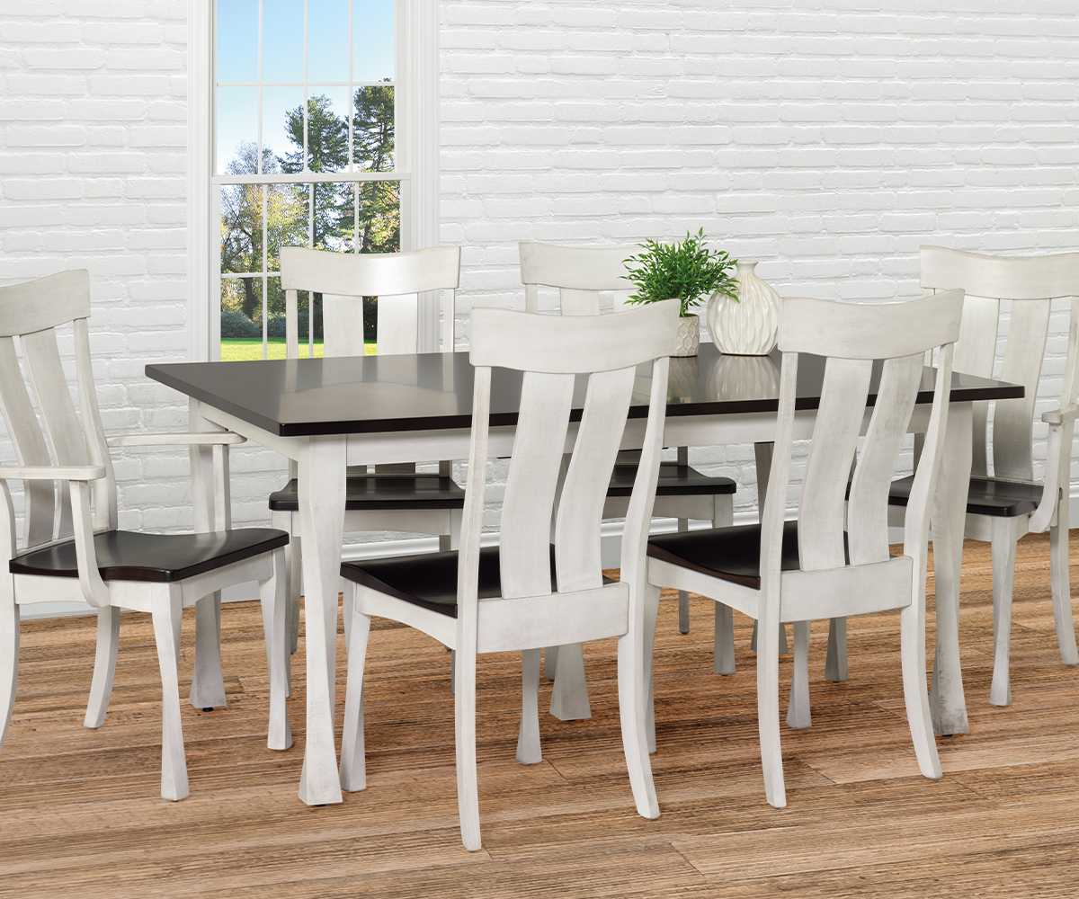 Table shown 42 x 60″ in maple with onyx top and frosted cotton signature combination on base. Square corner top with square edge. Franklin Twist chairs.